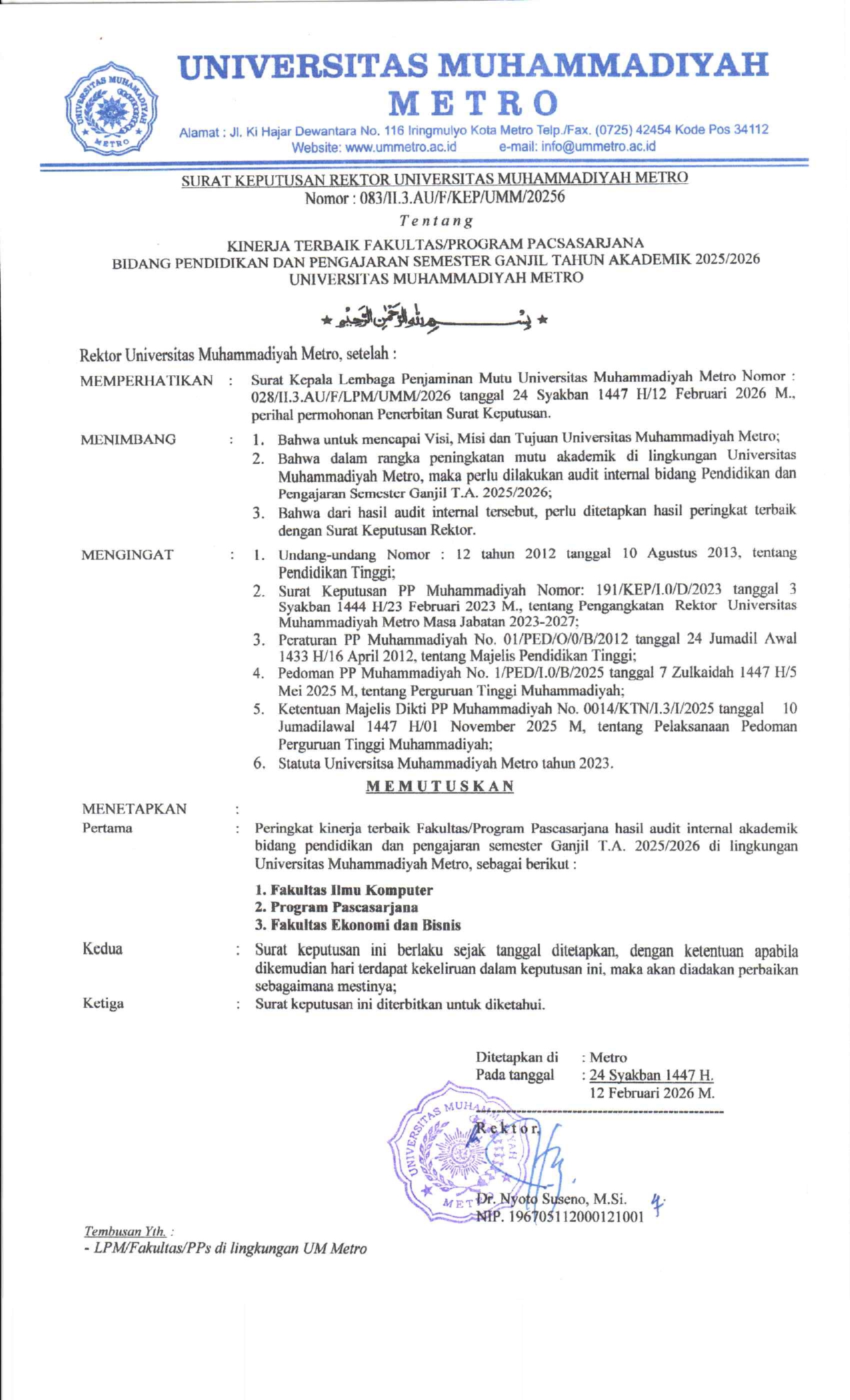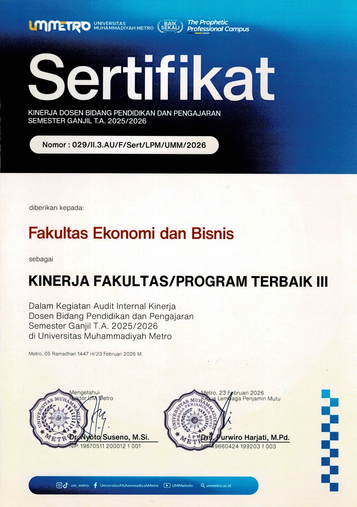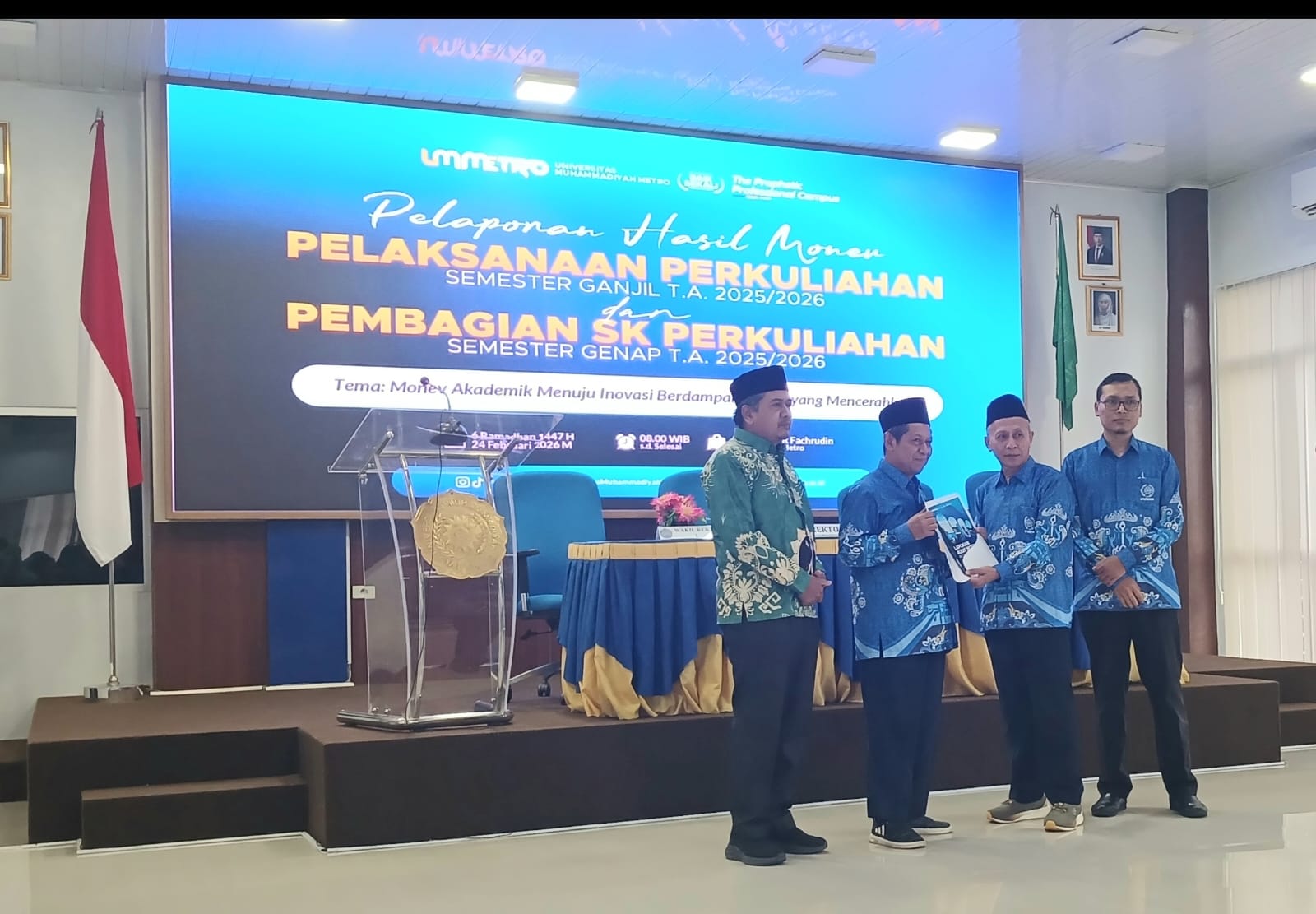 Penyerahan SK Rektor dan Sertifikat Kinerja Fakultas Terbaik di Lingkungan UM Metro Bidang Pendidikan dan Pengajaran Semester Ganjil 2025/2026